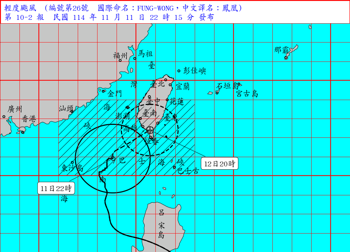 輕度颱風 鳳凰(國際命名 FUNG-WONG)11日22時的中心位置在北緯 20.9 度,東經 118.8 度,即在鵝鑾鼻的西南西方約 240 公里之處。