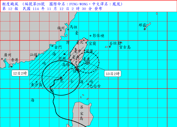 輕度颱風 鳳凰(國際命名 FUNG-WONG)12日2時的中心位置在北緯 21.1 度,東經 119.2 度,即在鵝鑾鼻的西南西方約 190 公里之處。