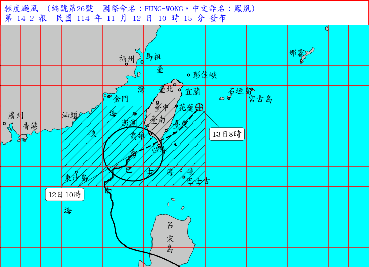 輕度颱風 鳳凰(國際命名 FUNG-WONG)12日10時的中心位置在北緯 21.6 度,東經 119.5 度,即在鵝鑾鼻的西南西方約 140 公里之處。